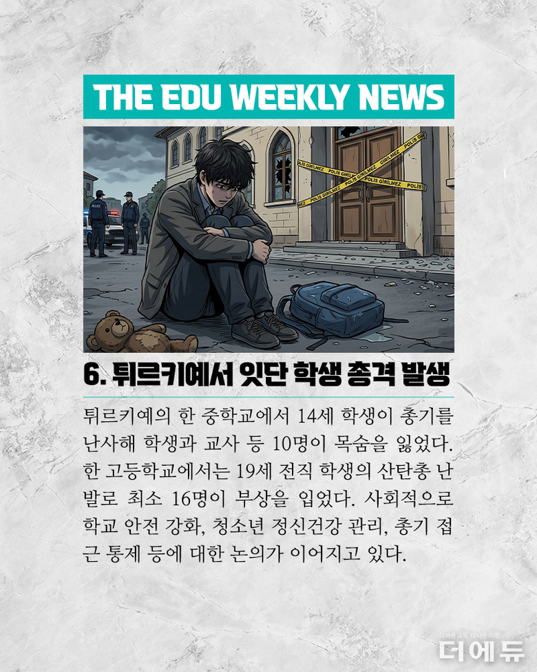 미국, 캘리포니아주 학자금 지원 허위 신청 최다 등 미국 교육부는 16일 주별 학자금 지원 허위 신청 적발 금액 순위를 발표했다. 현 정부에서 신분증 확인을 의무화한 이후로 가짜 신분 등이 적발된 사례다. 가장 많은 주는 캘리포니아주로 1억 7100만달러(약 2525억원)가 적발됐다. 버지니아주, 텍사스주, 플로리다주, 워싱턴주, 뉴욕주 등이 뒤를 이었다. 미네소타주에서는 한 학교에서만 100건이 넘게 적발됐다. 17일에는 캔자스주의 교육구 네 곳에서 남녀 차별을 금지한 교육법 9편(타이틀 나인)을 위반한 사실을 확인했다고 밝혔다. 해당 교육구들은 학생의 성별 전환을 학부모에게 공개하지 않도록 했으며, 동시에 여학생 화장실과 운동 경기에 자기 정체성을 근거로 남성 학생이 참여하도록 했다. 한편, 15일 오클라호마주의 폴스밸리 고교에서 반자동 권총을 소지한 남성이 침입했으나, 커크 무어 교장이 남성을 제압하면서 큰 사고를 막았다. 무어 교장은 다리에 총상을 입었으나 총기 난사 대응 훈련과 신의 가호 덕분에 위기를 넘겼다고 밝혔다. 프랑스 보안 사고로 학생 정보 유출 등 프랑스 교육부는 14일 사이버 공격을 받아 일부 학생의 정보가 유출됐다고 발표했다. 유출된