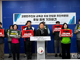 더에듀 전영진 기자 | 내년 강원교육감 선거에 진보진영 후보 단일화에 강삼영 전국교육자치혁신연대 상임대표와 최승기 비정규교수노조 강원지부장이 참여한다. 강원민주진보교육감후보단일화추진위원회(추진위)는 24일 도교육청에서 기자회견을 열고 강삼영 대표와 최승기 지부장이 추진위에 후보 등록했다고 밝혔다. 강삼영 대표는 ‘모두가 빛나는 진짜 강원교육’을 슬로건으로 내세웠다. 10대 공약으로 ▲문해력·수리력 기본학력 책임성 강화 ▲교육감 직속 교권보호 지원단 설치 ▲미래성장진로특수 조성과 만개의 학습동아리 운영 ▲노동 존중 행정과 교육 거버넌스 강화 ▲생태전환교육을 위한 탄소중립 학교 실현 ▲유·초·중·고 복합캠퍼스 구축 ▲위치·취약 학생 지원 대폭 강화 ▲학부모 연수원 설립 ▲AI 교육 대전환 테스크포스 설치 및 AI고등학교 설립을 제시했다. 최승기 지부장은 ‘자율과 연대의 강원교육’을 슬로건으로 삼았다. 10대 공약으로 ▲자율과 연대의 학교 ▲노동이 존중받는 학교 ▲생태전환 학교 ▲마음이 안전한 학교 ▲학생 맞춤 성장 ▲수업이 중심인 학교 ▲포용의 교육복지 ▲AI·디지털을 안전하게 잘 쓰는 학교(AI·디지털·미디어 리터러시) ▲지역대학과 연계된 글로컬 진로 ▲지역이