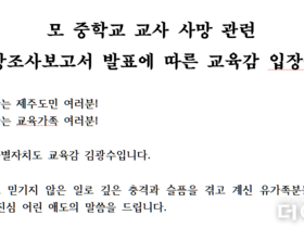 더에듀 지성배 기자 | 故현승준 교사 극단선택 사건과 관련해 김광수 제주교육감이 무거운 책임을 느낀다며, 학교 민원대응팀의 실질적 지원 체계의 확고한 정립에 나선다. 특히 순직 인정 절차에 적극 협조할 것을 약속했다. 김광수 제주교육감은 8일 이 같은 내용이 담긴 입장문을 발표했다. 이번 입장문은 지난 4일 진상조사반이 발표한 결과 보고에서 해당 학교의 민원대응팀이 적절하게 대응하지 못했다는 내용 등을 담은 데 따른 따른 후속 대책이다. 진상조사반은 민원대응팀이 민원처리를 끝까지 책임지지 않아 적절하게 대응하지 않은 책임이 있다고 봤다. 김 교육감은 “학교 민원 발생 시 학교 민원대응팀이 즉시 사전 대응하고 특이 민원으로 판단될 경우 지체없이 교육지원청과 도교육청이 직접 처리하는 체계를 확고히 정립하겠다”고 밝혔다. 제주교육청은 사건 발생 이후 교원 개인 연락처 비공개, 공식 민원 창구 표준화 등 사전 예방체계 구축과 특이민원 발생 시 책임 대응 및 사회 회복·제도 개선 방안을 담은 교육활동 보호 정책을 수립했다. 또 교장과 교감, 행정실장으로 구성된 학교 민원대응팀을 대상으로 지금까지 3차례의 연수를 실시했으며, 교원안심번호 제공, 우리학교 변호사 운영,