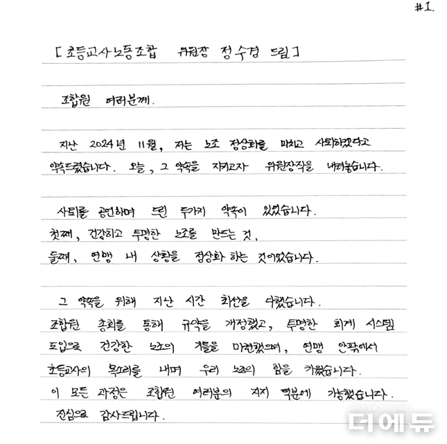 아래는 정수경 초등노조 제2·3대 위원장의 사퇴문.