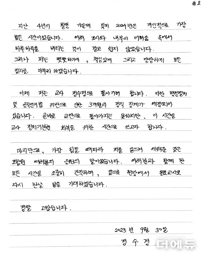 이어 “이제 교사 정수경으로 돌아가려 한다. 정직 3개월이 예정돼 있어 곧바로 교단으로 돌아가지는 못하지만 이 시간을 교사 정치기본권 회복을 위한 시간으로 쓰고자 한다”며 “여러분과 함게 한 모든 시간을 소중히 간직하며, 앞으로 현장에서 동료교사로 다시 만날 날을 기대하겠다”고 밝혔다.