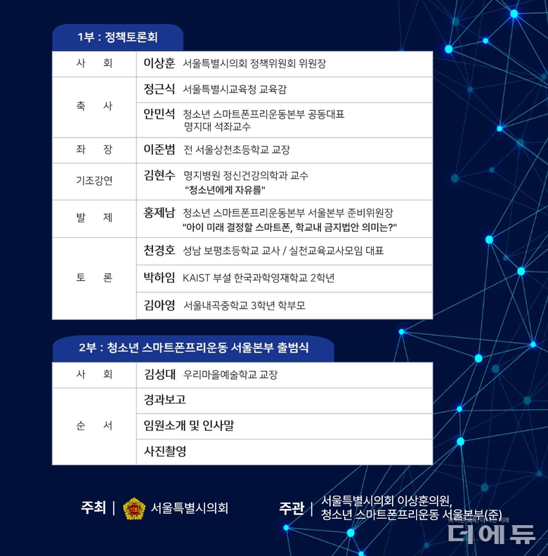 출범식에 앞서 전문가와 시민이 함께하는 심도 있는 정책 토론이 진행된다. 토론회 기조 강연은 김현수 명지병원 정신건강의학과 교수가 맡았으며 ‘청소년에게 자유를’이라는 주제로 스마트폰으로부터의 해방이 청소년의 건강한 성장에 미치는 긍정적 효과를 설명한다.