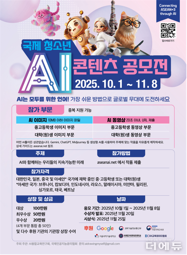 AI융합교육연구회와 국제인공지능윤리협회가 공동으로 주최주관하는 이번 공모전 ‘AI로 하나되는 아세안+3, 함께 그리는 우리들의 미래’가 슬로건이다.