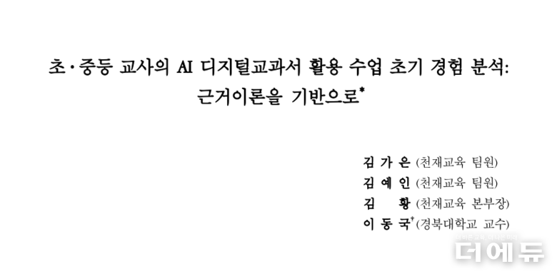 김가은, 김예인, 김황(이상 천재교육), 이동국 경북대 교수가 AIDT를 수업에 직접 활용하고 있는 초·중등 교사 56명을 대상으로 초기 사용 경험을 심층 분석한 논문 ‘초중등 교사의 AIDT 활용 수업 초기 경험 분석: 근거이론을 기반으로’을 교육공학연구 제41권 제3호에 발표했다.