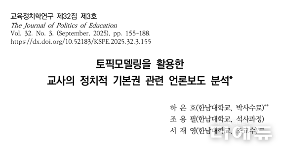 하은호, 조용필, 서재영(이상 한남대)은 1990년 1월 1일부터 2024년 11월 5일까지 보도된 관련 기사 1621건을 텍스트 마이닝과 토픽모델링 기법으로 분석한 연구 ‘토픽모델링을 활용한 교사의 정치적 기본권 관련 언론보도 분석’ 결과를 교육정치학연구에 발표했다.