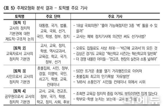 연구팀은 주제모형화분석(LDA)을 통해 ▲교사의 정치적 기본권에 대한 제도적·구조적 논의 ▲교육자로서 교사의 정치적 기본권 ▲시민으로서 교사의 정치적 기본권 ▲공무원으로서 교사의 정치적 기본권 등 4개의 잠재적 토픽을 도출했다.