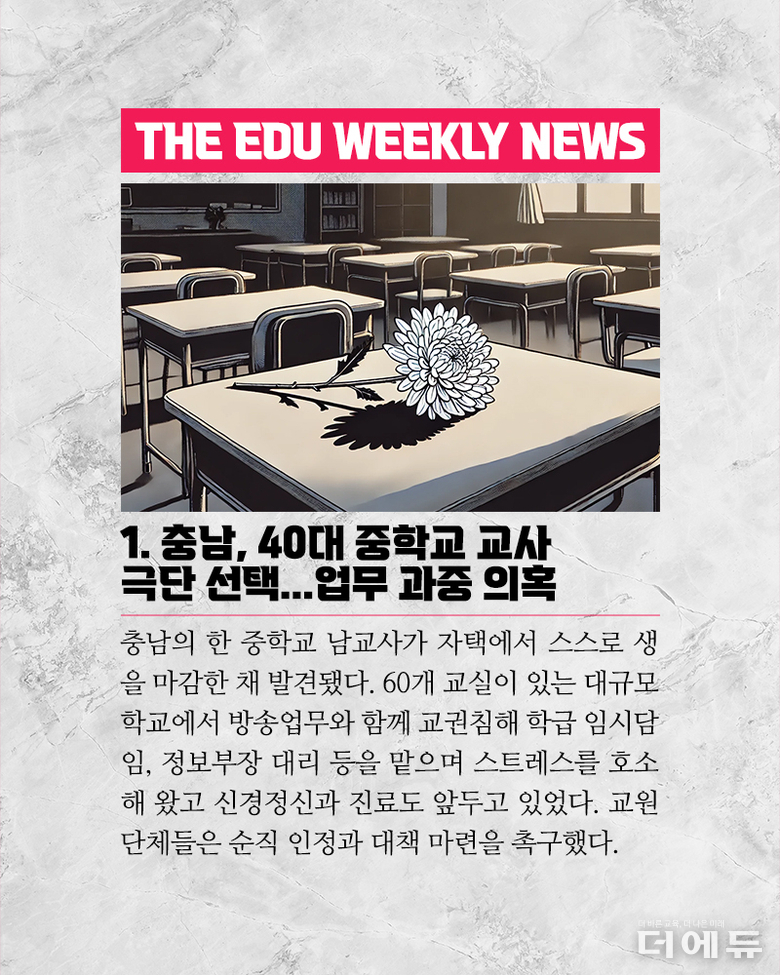 [주간 카드뉴스-10월 2주차] '충남 중학교 교사 사망, 초등노조 위원장 선거, TALIS 2024 발표, 덴마크 학생 난독증 검사 부모 동의제 폐지'