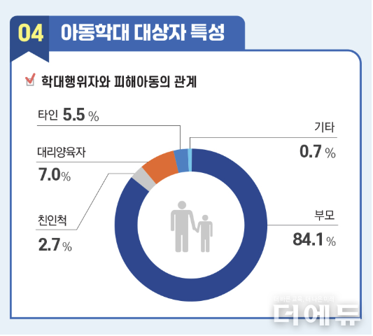 아동권리보장원의 2024년 아동학대 통계에 따르면, 아동학대 대상자의 84.1%는 부모이고, 7.0%는 대리 양육자, 2.7%는 친인척이었다.