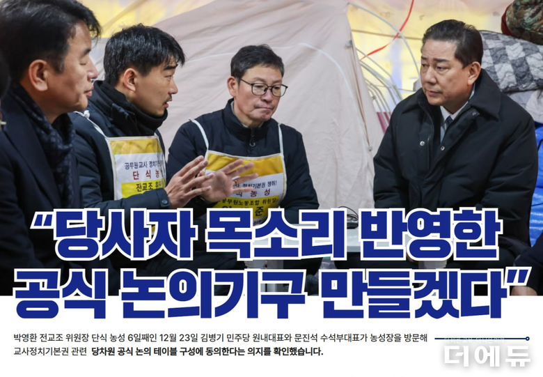 김병기 민주당 원내대표와 문진석 수석부대표는 지난 23일 국회 앞 단식 투쟁 농성장을 방문해 교사와 공무원의 정치기본권 보장과 관련한 당차원의 공식 논의 테이블을 구성하겠다고 밝혔다.