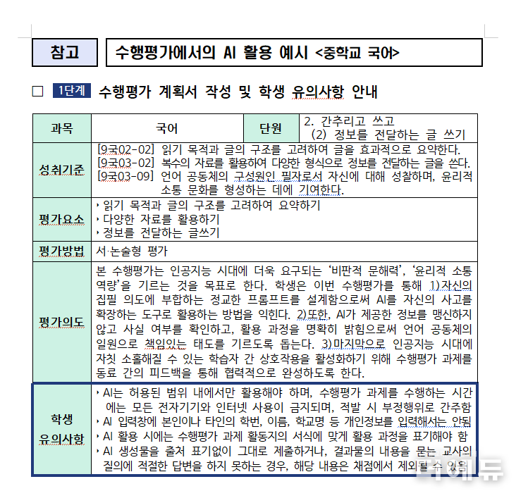 수행평가 전에 AI 활용 관련 상세 기준 및 유의 사항을 안내하고 올바른 AI 활용 교육을 실시해야 한다.
