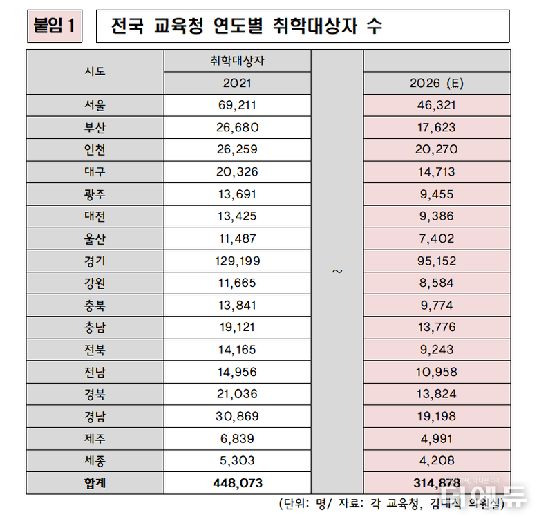 김대식 국민의힘 의원은 19일 이 같은 내용이 담긴 ‘2021~2026년 취학대상자 현황 분석 결과’를 공개했다. 자료는 전국 시도교육청으로부터 제출 받았다.