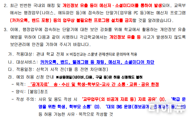 더에듀 김연재 수습기자 | 학교 업무용 PC에서 카카오톡, 밴드, 텔레그램 등 채팅·메신저·소셜미디어 사용을 전면 금지하는 교육부와 이를 그대로 시행한 경기교육청이 논란에 휩싸였다.