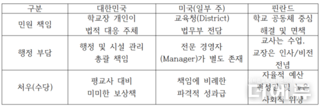 미국의 경우, 학교에서 발생하는 법적 분쟁은 개별 학교장이 아닌 교육청 단위의 법무 전담팀이 전면에 나선다. 학교장은 오직 교육적 결정에만 집중하도록 제도적으로 보호받고 있다. 반면 우리나라에서는 모든 고통을 학교장 한 사람의 ‘버텨내기’에 의존하고 있는 실정이다.