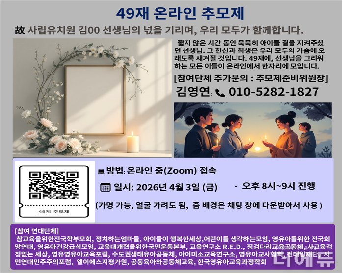 영유아를 위한 전국희망연대(영유아 전국희망연대)는 오는 3일(금) 저녁 8시 고인의 49재를 맞아 온라인으로 추모제 ‘선생님, 그곳에선 아프지 마세요!!’를 연다고 2일 밝혔다. 화상회의 플랫폼 ZOOM을 통해 진행한다.