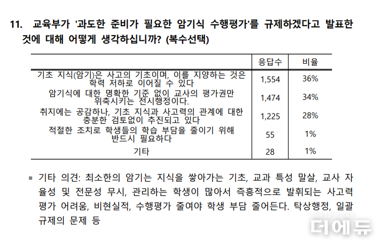 그러면서 암기식 수행평가 규제에는 36%가 기초 지식 약화로 인한 학력 저하를, 34%는 명확한 기준 없이 교사의 평가권만 위축 등을 우려했다.