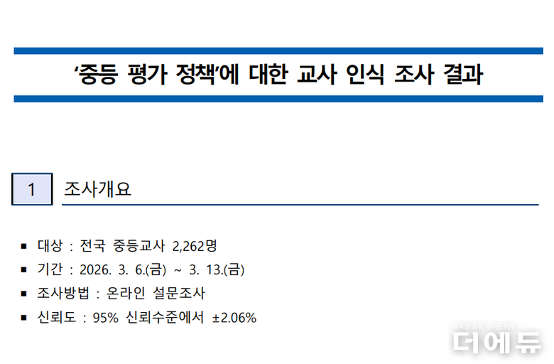 중등교사노조는 7일 이 같은 내용이 담긴 ‘중등 평가 정책에 대한 교사 인식 조사’ 결과를 발표했다. 이번 설문은 지난 3월 6~13일 온라인으로 진행됐으며, 전국 중등교사 2262명이 참여했다.