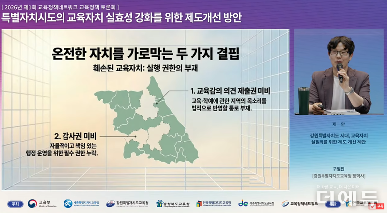 더에듀 김연재 기자 | 특별자치시도의 교육자치 실효성 강화 방안으로 실질적 권한 이양과 지역 맞춤형 교육과정 고안, 정책 자율성 확대 및 입시 제도 연계 교육 개혁 협력 거버넌스 구축 등이 제안됐다.