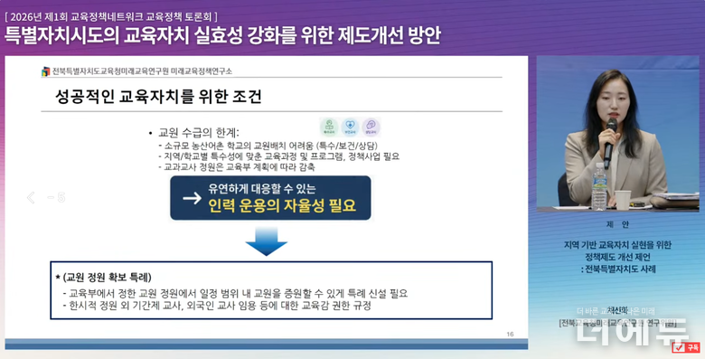 이어 지역이 필요로 하는 우수 인재를 적재적소에 배치할 수 있도록 인사권 강화 필요성을 제기하며 ▲지역 맞춤형 교원 정원제 실시 ▲지역 임용 트랙의 자율권 확보를 대안으로 제시했다.