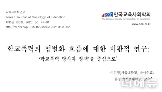 같은 달 ‘교육사회학연구’에 게재된 이민정·유성상 연구팀의 ‘학교폭력의 엄벌화 흐름에 대한 비판적 연구: 학교폭력 당사자 정책을 중심으로’는 땜질식 사안처리 중심 정책 흐름이 학교폭력을 ‘교육적 문제’가 아닌 ‘사법적 사건’으로 구성해 왔다고 비판한다.