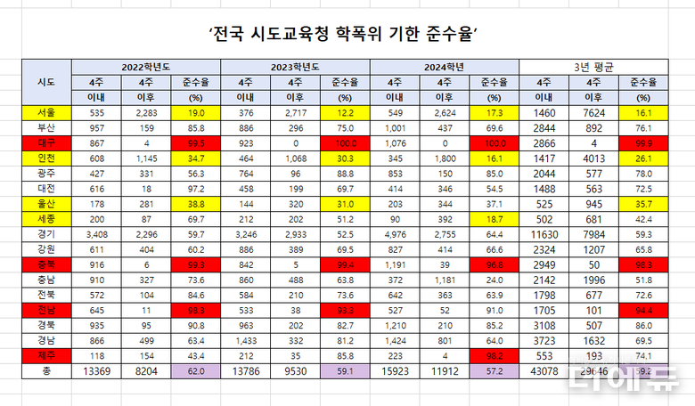[단독] 서울·인천교육청, 학폭위 심의 기한 준수율 10% 수준...99.9% 대구와 대조