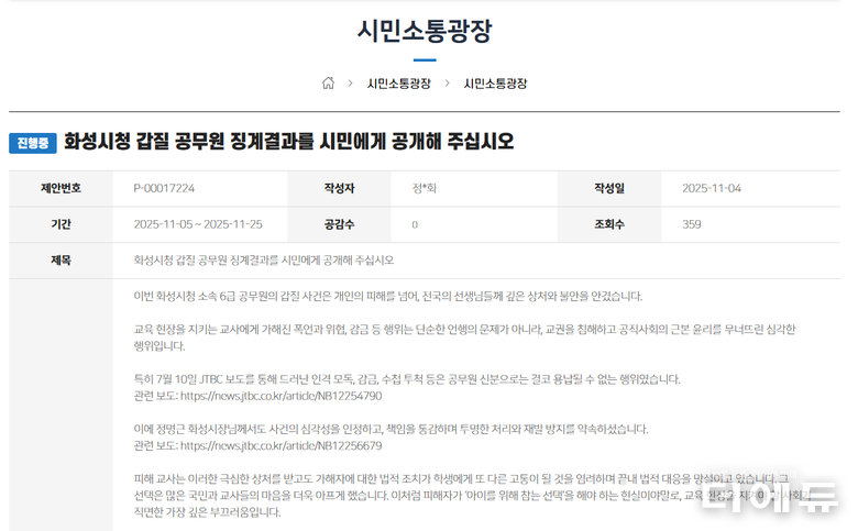 이에 청원인은 “남은 일은 화성시가 책임을 다하는 일”이라며 “공직자의 잘못이 내부에서만 조용히 처리된다면, 시민의 불신과 교사들의 절망은 더 깊어질 것”이라고 강조했다.