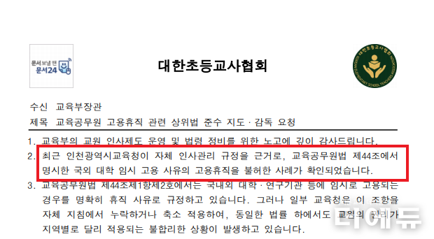 앞서 <더에듀>는 단독 보도를 통해, 인천교육청이 국외 대학 임시 고용을 앞둔 교사에 대한 고용 휴직을 불허하고 있어 교육공무원법 위반 아니냐는 문제를 제기했다.