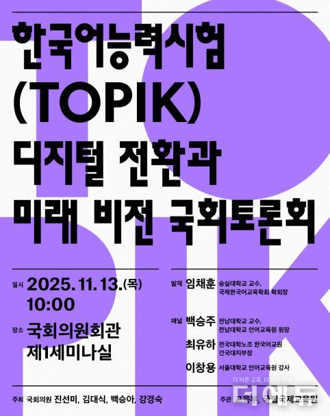 교육부는 오는 13일 오전 10시 국회 의원회관에서 ‘한국어능력시험 디지털 전환과 미래 비전 국회 토론회’를 연다고 12일 밝혔다. 이번 토론회는 국회 교육위원회 소속 백승아·진선미 더불어민주당 의원, 김대식 국민의힘 의원, 강경숙 조국혁신당 의원이 공동 주최한다.