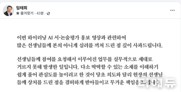 그는 “앞으로 더욱더 꼼꼼히 살펴 이러한 일이 재발하지 않도록 챙길 것이며, 보다 신중한 자세로 교육 정책과 소통에 힘쓸 것을 약속드린다”고 밝혔다.