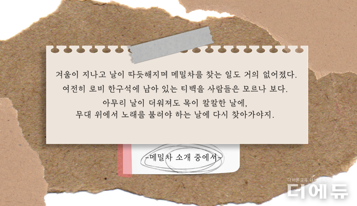 어떤 소재로 노래를 만들까 고민하던 중, 제가 마시던 메밀차가 눈에 들어왔어요. 학교에서 저 말곤 아무도 메밀차를 마시지 않았거든요. 저는 무대 때문에 목 관리를 하기 위해 메밀차를 마셨는데, ‘무대가 끝나면 이제 아무도 찾지 않겠구나’ 하는 생각이 들었어요. 그래서 메밀차를 주제로 노래를 만들어 보았습니다.