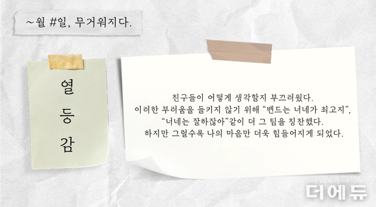 하지만 저는 이 부러움을 티 낼 수 없었어요. 친구와 사이가 안 좋아질까 봐, 애들이 어떻게 생각할지 부끄러웠거든요. 이러한 부러움을 들키지 않기 위해 저는 “밴드는 너희가 최고지”, “너희는 잘하잖아” 같이 일부러 더 그 팀을 칭찬했지만 그럴수록 저의 마음만 더욱 힘들어졌어요.