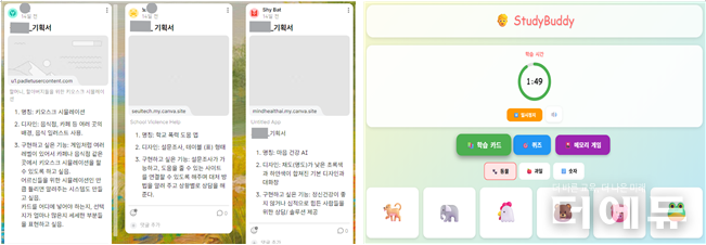어떤 학생은 발달장애아동을 위해 쉽게 학습할 수 있는 카드형 퀴즈 웹앱을 만들었고, 또 다른 학생은 친구와의 갈등 상황에서 비대면 대화를 통해 서로의 감정을 이해하도록 돕는 웹앱을 만들었다. 스트레스 관리 체크리스트나 하루 마음 기록 앱처럼, 일상에 실제로 도움이 되는 기능들도 학생들의 기획안과 작품 속에서 자연스럽게 드러났다.