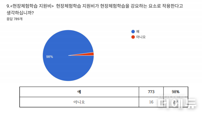 특히 교사들의 85.7%는 ‘현장체험학습 지원비를 폐지해야 한다’고 응답했으며, 98%는 ‘지원비가 현장체험학습을 강요하는 요소로 작용한다’고 답했다. 인천교육청은 매년 유치원 8만원, 초6 25만원, 중2 25만원, 고2 45만원의 지원비를 지급하고 있다.