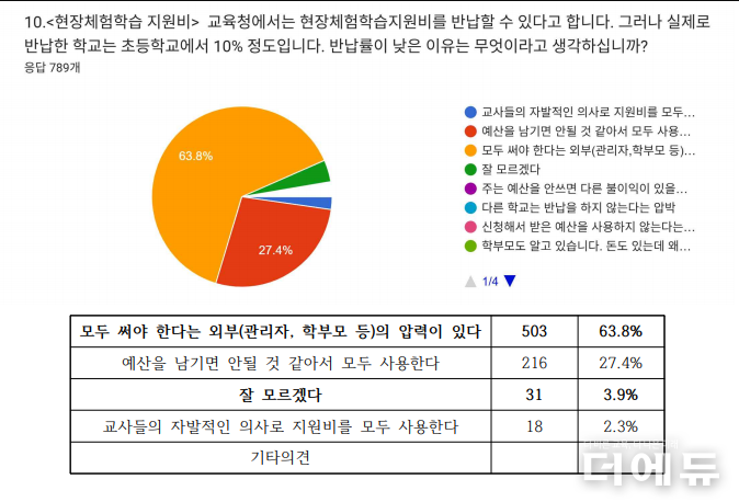 지원비를 반납하지 못하는 이유로는 63.8%가 예산을 모두 사용해야 한다는 외부 압력이 있다고 답변했다. 자발적으로 모두 사용한다는 답변은 2.3%에 불과했다. 90.2%의 교사들은 현장체험학습 지원비를 교내 체험학습에서도 사용할 수 있게 하는 데 찬성했다.