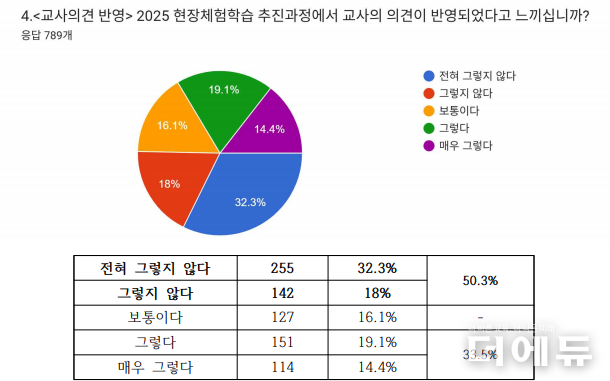 현장체험학습 운영 과정에서 교사 의견 반영 여부를 묻는 질문에는 부정적 답변이 50.3%(전혀 그렇지 않다(32.3%), 그렇지 않다(18%))로 나왔다. 특히 중등에선 60%(중학교 68.6%, 고등학교 81.2%)를 넘었다.