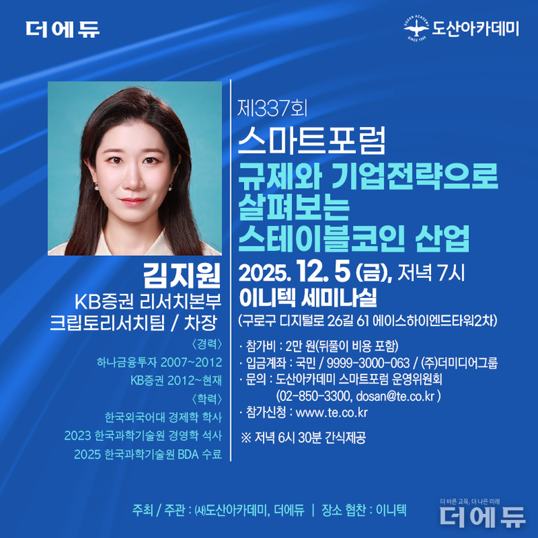 더에듀 전영진 기자 | 김지원 KB증권 리서치본부 연구위원이 정책과 기업 사례를 통해 스테이블코인 산업의 현재와 미래를 조망한다.