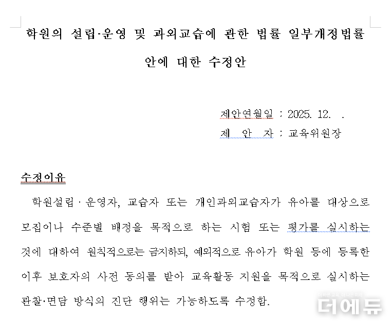 개정안의 내용은 학원설립·운영자, 교습자 또는 개인과외교습자가 유아를 대상으로 모집이나 수준별 배정을 목적으로 하는 시험 또는 평가 실시를 원칙적으로는 금지하는 것이다.