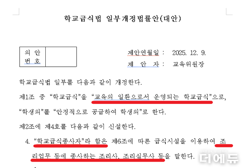 더에듀 지성배 기자 | 학교급식을 법적 교육으로 인정하고, 학교급식종사자에 대해 법적으로 정의하는 내용 등이 담긴 학교급식법 개정안이 국회 교육위원회를 통과했다. 무려 7명의 국회의원이 낸 개정안이 조율됐다.