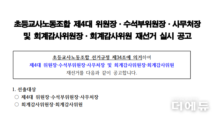 더에듀 지성배 기자 | 투표율 미달로 재선거를 치르게 된 초등교사노동조합(초등노조) 제4대 위원장 선거에 후보가 늘어 각축전이 예상된다.