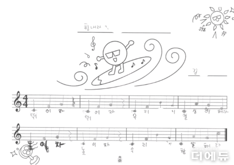 친구의 특징을 생각하며 어울리는 응원 가사도 함께 작성했다. 학생들은 작곡, 가사 작성, 녹음까지의 과정을 순차적으로 경험하며 하나의 음악이 완성되는 흐름을 이해했다. 완성된 응원가는 녹음 후 실제 체육 시간에 활용됐다.