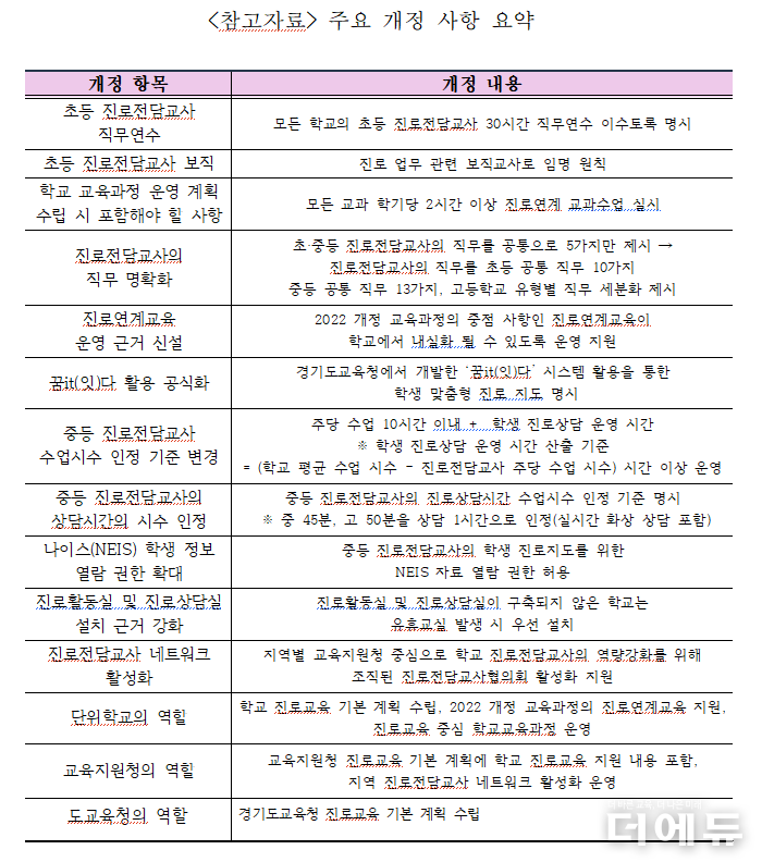 또 ▲중등 진로전담교사 진로상담시간 수업시수 인정 기준 명시 ▲중등 진로전담교사의 NEIS 자료 열람 권한 허용 ▲진로삼담실 미구축 학교 유휴교실 발생 시 우선 설치 등도 담았다.
