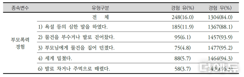 부모를 폭행한 청소년은 전체 학생 대비 9.6%이나, 학폭 경험 학생 대비 30.1%에 달했다. 구체적으로 피해 22.1%, 가해 8.7%, 피·가해 69.1%의 비율을 보였다.