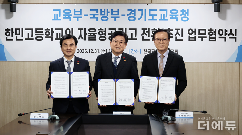 더에듀 지성배 기자 | 군인 자녀들의 안정적 학업을 목표로 설림된 한민고등학교의 자율형공립고(자공고) 전환이 추진된다. 교육부와 국방부, 경기교육청은 이를 위해 업무협약을 체결, 자공고 전환에 협력한다.