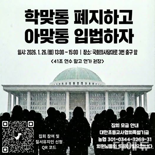 한편, 대한초등교사협회(대초협)는 내년 1월 26일 국회 앞에서 학맞통법 폐지를 촉구하는 집회를 예고해 진통이 예상된다. 이들은 집회를 통해 교육과 복지의 명확한 구분을 요구, 아동맞춤통합지원법(아맞통) 제정으로 방향 전환을 요구할 방침이다.
