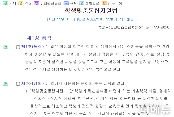학맞통법은 2026년 3월 1일부터 시행된다. 제1조는 학생이 학교 안팎의 삶에서 겪는 다양한 어려움을 극복하도록 학습·복지·건강·진로·상담 등의 통합적 지원을 제공함으로써 교육받을 권리와 전인적 성장을 보장하는 것을 목적으로 명시한다.