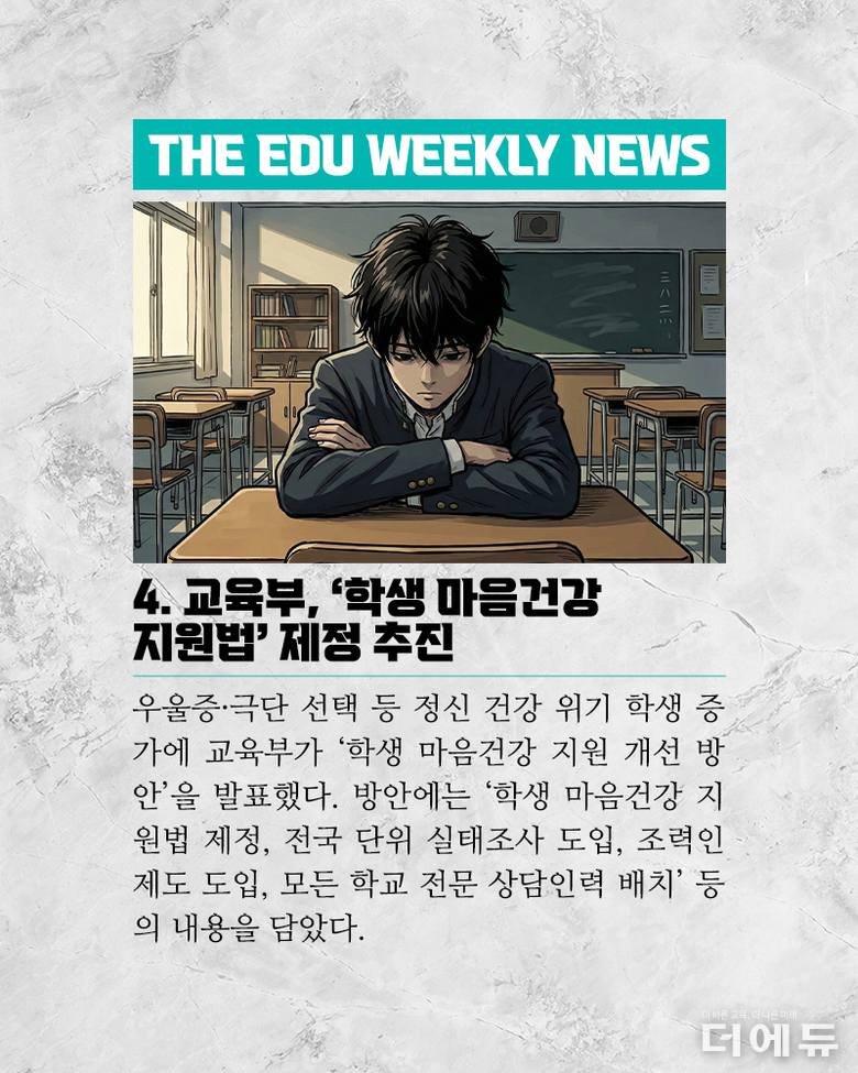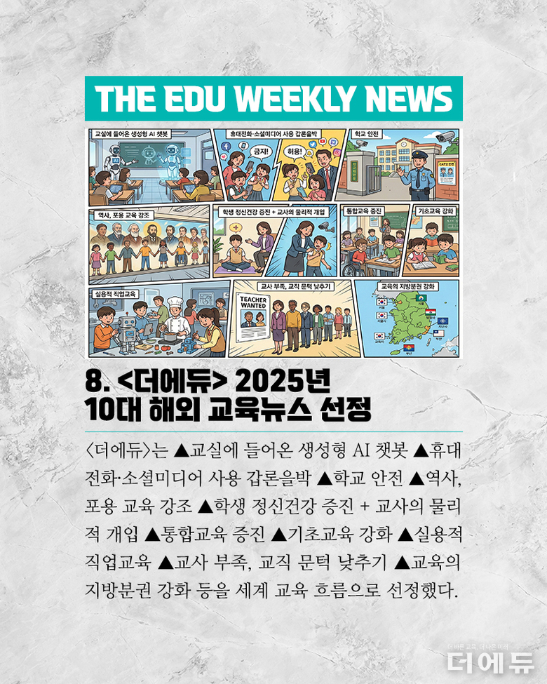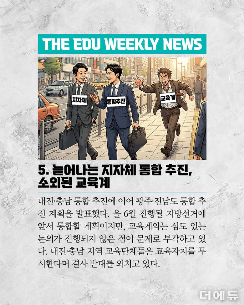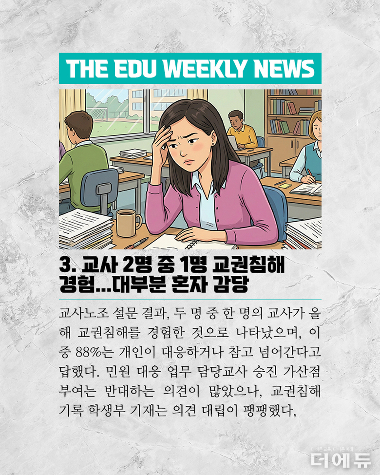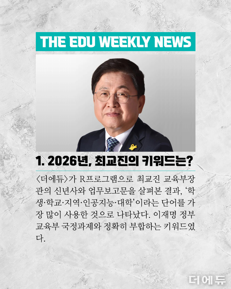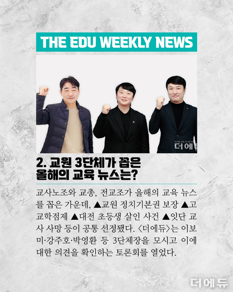 더에듀 지성배 기자 | 2025년, 어느덧 마무리의 시간이 다가왔다. 올해 대한민국에서는 정권 교체라는 큰 바람이 불었으며, 이에 따라 교육계에서는 교육부장관이 바뀌는 등 큰 변화의 시작점이 됐다. 그러나 교육은 백년지대계라는 말처럼, 이전 정부를 넘어 그 이전부터 진행한 정책에 대한 부작용 그리고 새로 시작한 정책의 현장 정합성 부족 또 내년 시행할 정책에 대한 논란 등 해소되는 문제 없이 쌓여가기만 하고 있다. 이에 더에듀는 이보미 교사노동조합연맹 위원장, 강주호 한국교원단체총연합회 회장, 박영환 전국교직원노동조합 위원장 등 교원3단체의 장을 모시고, 올해의 교육 이슈를 정리하고 내년에 주목해야 할 아젠다를 살펴보는 시간을 가졌다. 3단체장이 같은 장소에 모여 동일한 아젠다로 입장을 밝히는 것은 역사상 첫 사례이다. 이를 위해 더에듀는 각 단체에 올해의 교육뉴스 선정을 요청했으며, 이중 중첩되는 이슈 네 가지 ▲교원 정치기본권 보장 ▲고교학점제 ▲대전 초등생 살인 사건과 후속 대책 ▲잇단 교사 사망 사건을 토론 아젠다로 선정했다. 나머지 이슈들은 각 단체별로 정리해 더에듀 기사로 소개할 예정이다. 이번 영상은 전체 버전이다. 진행 : 지성배 더에듀 편집국