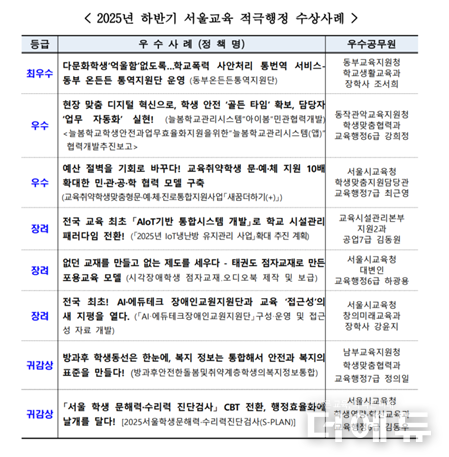 장려상은 김동원 교육시설관리본부 주무관(주사보), 하광용 서울교육청 주무관(주사), 강윤지 서울교육청 장학사가 귀감상에는 정의일 남부교육지원청 주무관(주사보), 김동우 서울교육청 주무관(주사)가 선정됐다.
