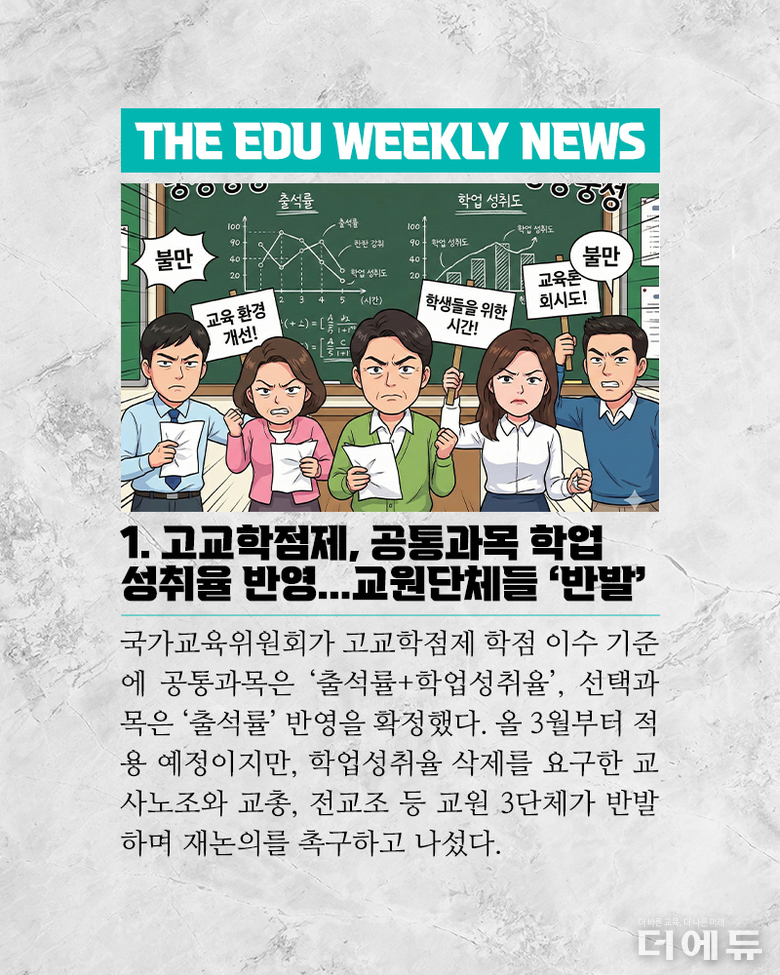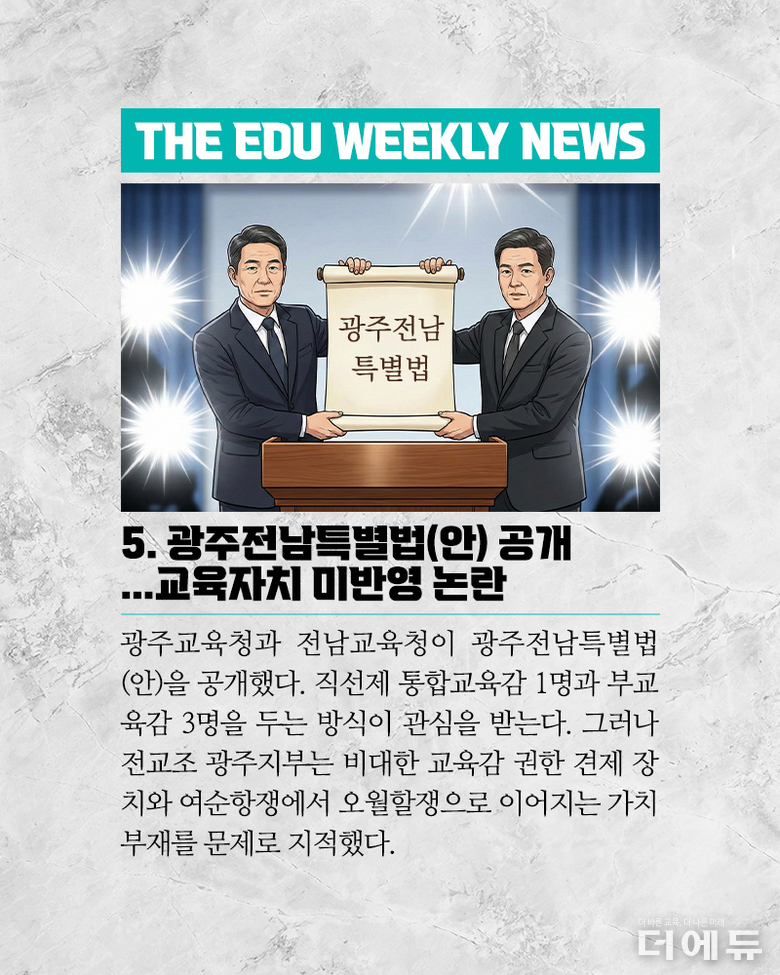 [주간 카드뉴스-1월 3주차] '고교학점제 과목 이수 기준 확정 논란, 초등노조 위원장에 강석조 당선, 광주전남특별법안 논란, 미국 뉴저지 학교 내 휴대전화 사용 금지'