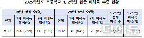 대전교육청은 지난 20일 관내 초등 1, 2학년 한글 미해득 학생 비율이 0.72%로 조사됐다고 밝혔다. 2022년 0.85%, 2023년 0.82%, 2024년 0.79%에 이어 4년 연속 감소한 수치이다. 학년별로는 1학년 1.30%, 2학년 0.20%로 집계됐다.