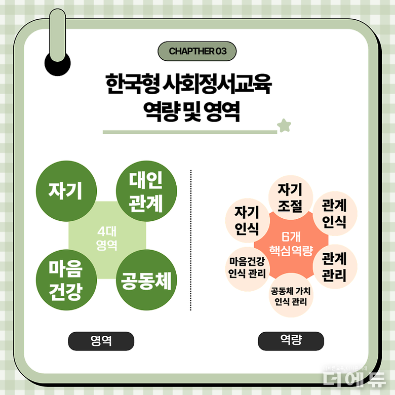 사회정서교육이란 학생들의 긍정적인 성장과 정신건강 증진을 목표로 사회정서역량을 강화하는 학교 기반의 보편적 마음건강 교육을 뜻한다. 핵심역량으로는 ▲자기감정 ▲관계 ▲공동체 가치 ▲정신건강에 관한 인식·관리가 있다. 국정과제 101-5번 ‘학생 마음건강 지원을 위한 다층적 지원 체계 구축’의 일환으로 담겼다.