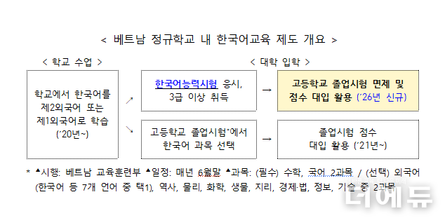 베트남은 2020년 한국어를 제2외국어로 채택했으며, 한국어능력시험 성적 대입 반영은 외국어 과목을 대체할 수 있다는 의미이다. 구체적으로 3급 이상 취득한 학생은 졸업시험 1개를 면제받고 환산된 점수는 졸업시험 성적으로 인정된다.